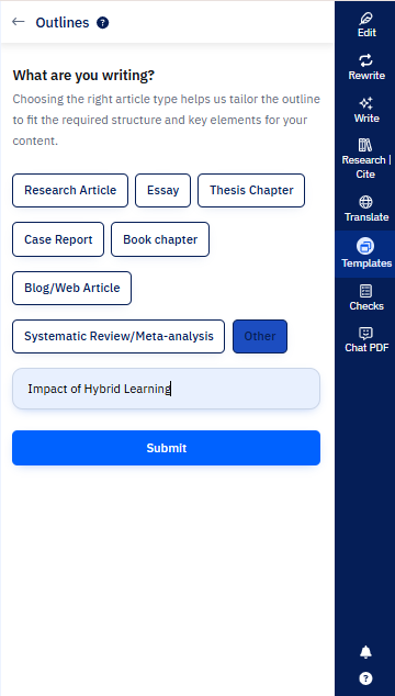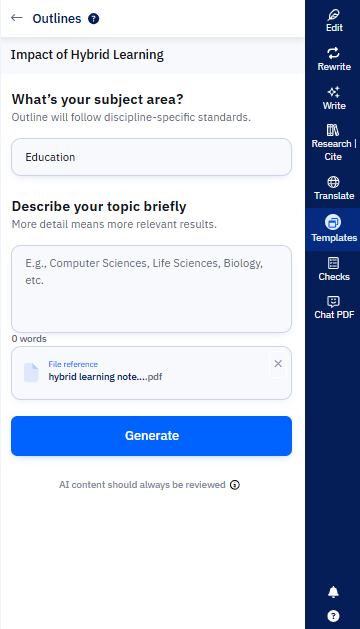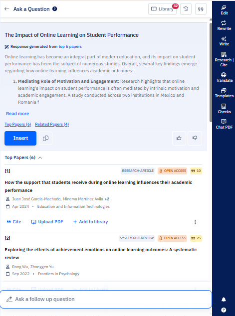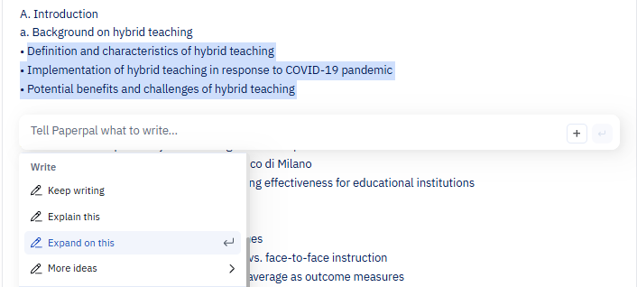 Use credible sources to make your evidence relevant and up to date. Start with Paperpal Research to build a foundation for your report. Search for studies, definitions, and recent statistics on The Impact of Hybrid Learning. Paperpal provides summarized insights from verified academic sources, helping you understand key themes, gaps, and evidence you may want to include in your report.