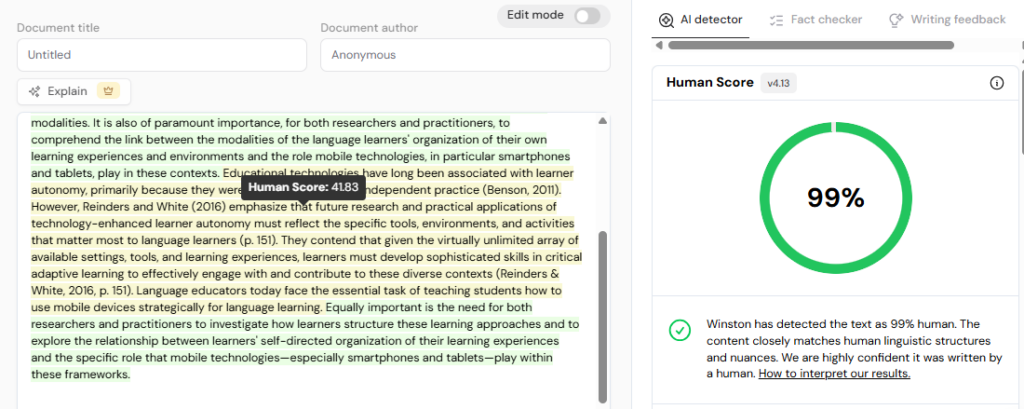 | Winston generates shareable PDF reports, which serves as hard evidence of your paper | Like Originality.ai, it uses a credit system. If you scan the same document twice (e.g., after making a small edit), you pay double |
