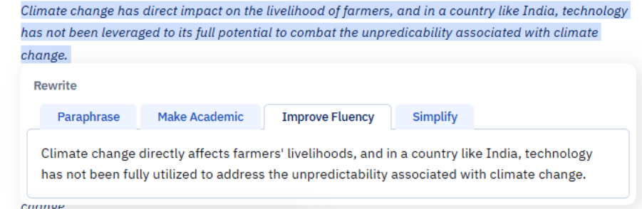 Paperpal AI Output: “This delay in technological adoption exacerbates existing agricultural challenges, hindering productivity improvements and sustainable practices. In India, where agriculture plays a crucial role in the economy and food security, the slow integration of new technologies can lead to: