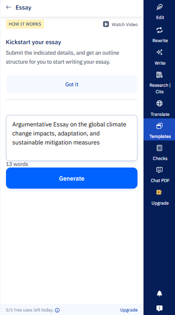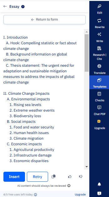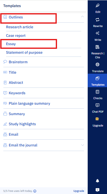 - エッセイアウトラインの生成:「テンプレート」セクションで「アウトライン」タブをクリックし、選択肢から「エッセイ」を選んでトピックを入力するとアウトラインが生成されます