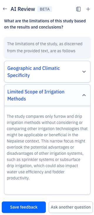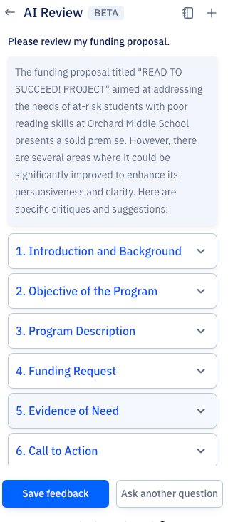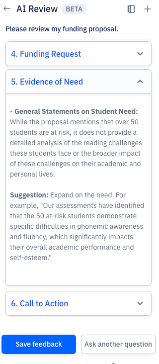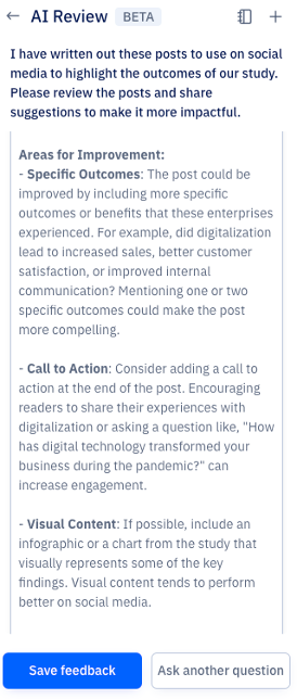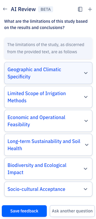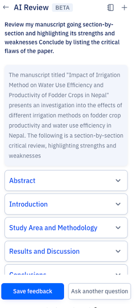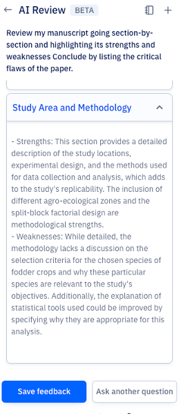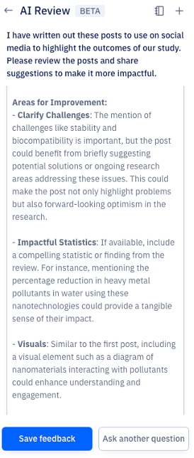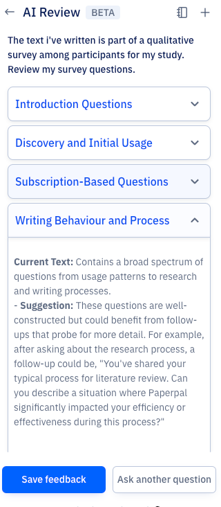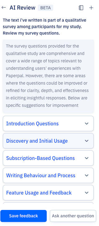 AIレビューは、Paperpalの研究者・学術関係者向けの実験的機能です。上記の使用例や、執筆時に研究論文のレビューを素早く受け取りたい場合にぜひお試しください。AI論文レビューの際、後日また戻って提案を見直したい場合は、「Save Feedback」ボタンをクリックしてください。保存されたフィードバックは、特定の文書テキストにマッピングされ、参照用に保存されるため、簡単にアクセスできます。