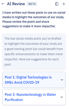 Paperpalでは、学生、学者、研究者の皆さんの研究、執筆、推敲、提出のプロセスをよりスムーズにするために、製品の継続的な改善に取り組んでいます。信頼のおけるリサーチライティングアシスタントを利用して執筆内容をセルフレビューすることは、投稿前に客観的な視点で自分の文章を評価し、一歩先を行くための強力な手段となります。今すぐAIレビューをお試しください。また、hello@paperpal.com までご遠慮なくフィードバックをお寄せください。