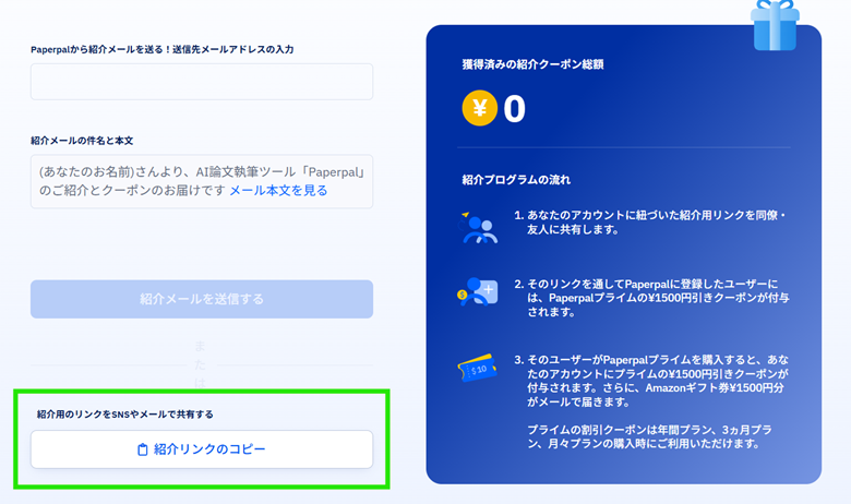 3: 紹介プログラムのページ上、「紹介リンクのコピー」をクリックして、ご紹介者様専用のリンクをコピー
