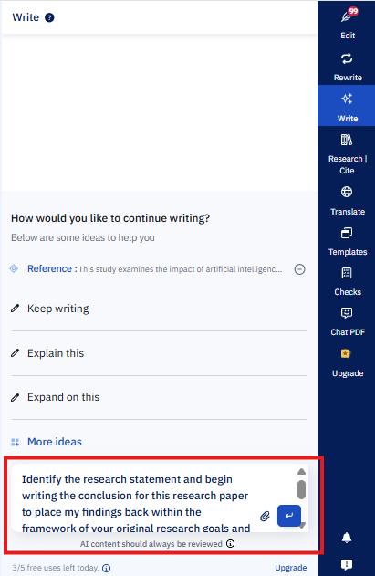 研究論文の結論は、まず研究目的を簡潔に再提示することから始めます。これにより、論文全体を通じて主張してきた主要な論点を読者に再確認させます。簡潔かつ明瞭にまとめることが重要です。単に原文をそのままコピー&ペーストするのではなく、Paperpalの支援を受けながら提示した証拠内容を踏まえて、表現を工夫して言い換えましょう。